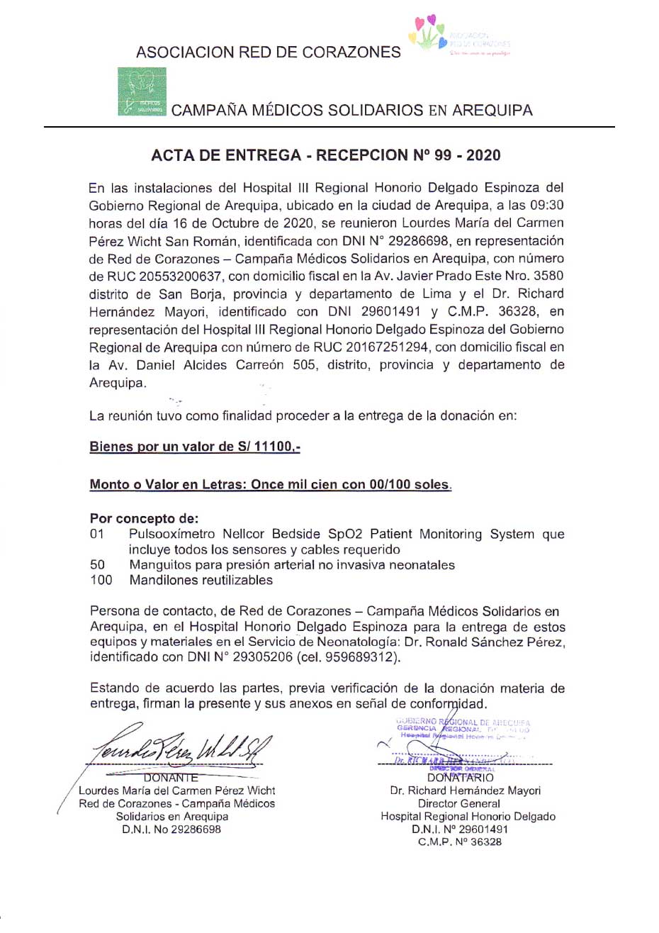 Unión y acción: #CampañaMédicosSolidariosArequipa y nuestro aliado #RedDeCorazones tuvimos el gusto de entregar a la Unidad de Cuidados Intensivos Neonatales del Hospital Honorio Delgado: