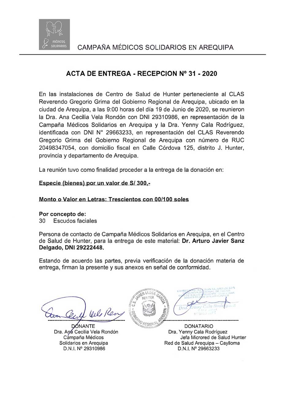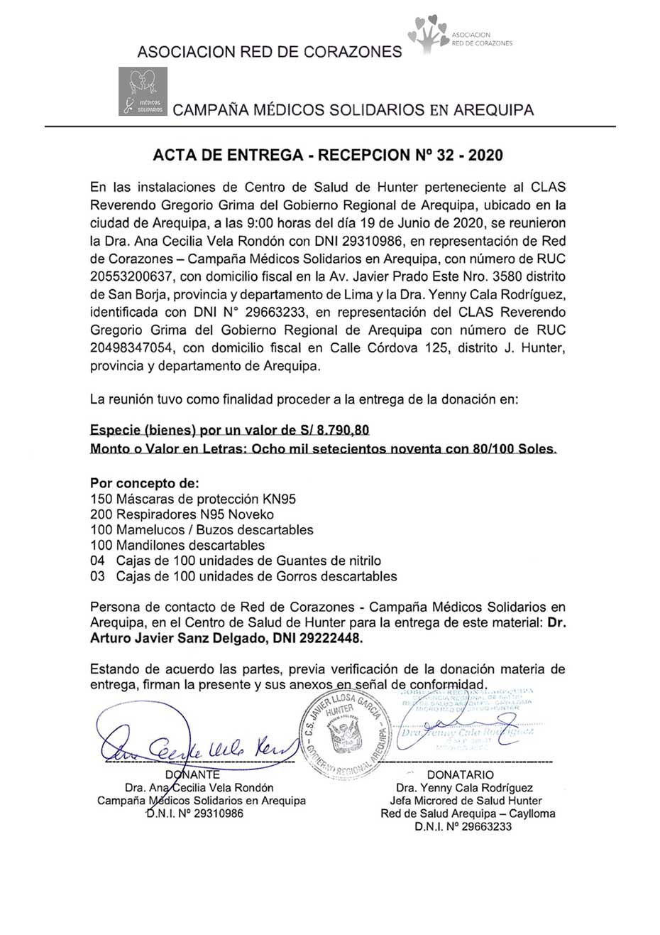 La Red de Corazones y la Campaña Médicos Solidarios en Arequipa entrega una donación al Centro de Salud Hunter.