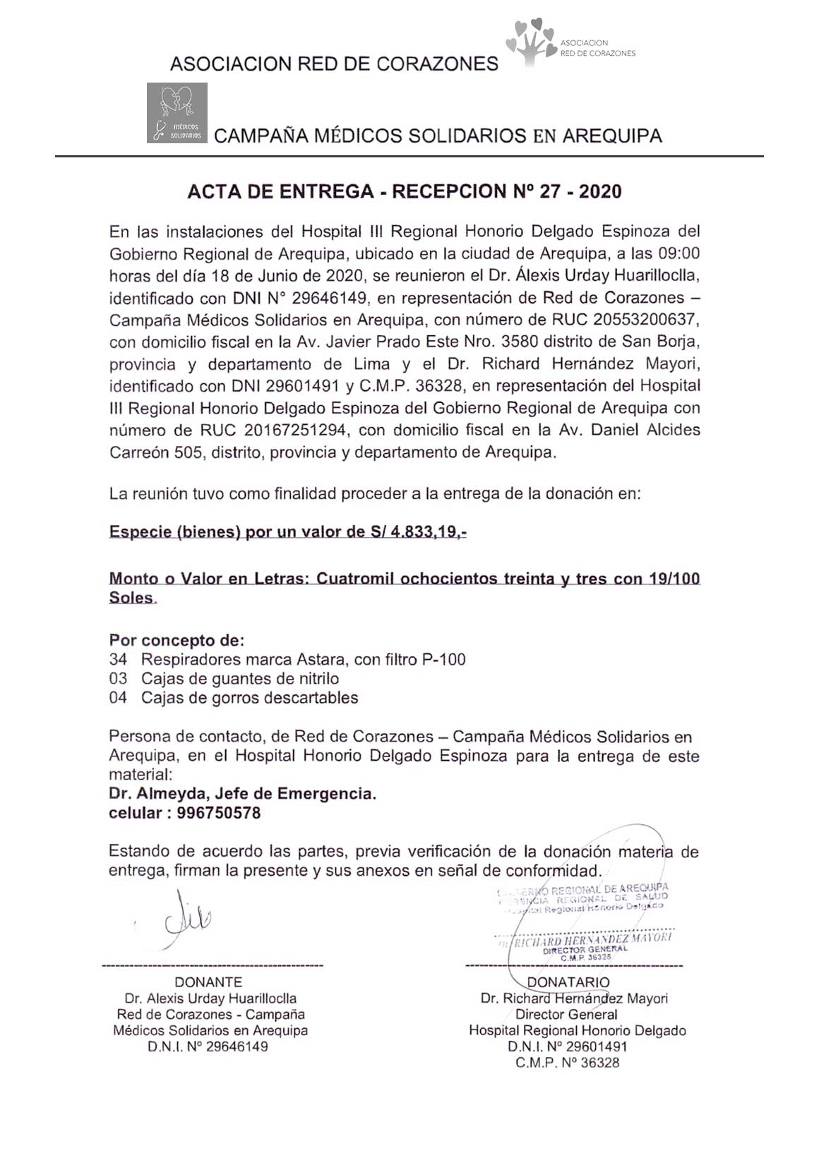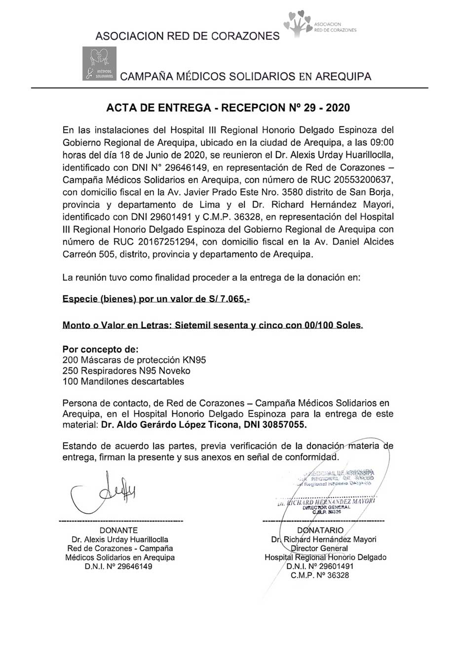 La Red de Corazones y la Campaña Médicos Solidarios en Arequipa entrega una donación al Hospital Honorio Delgado.