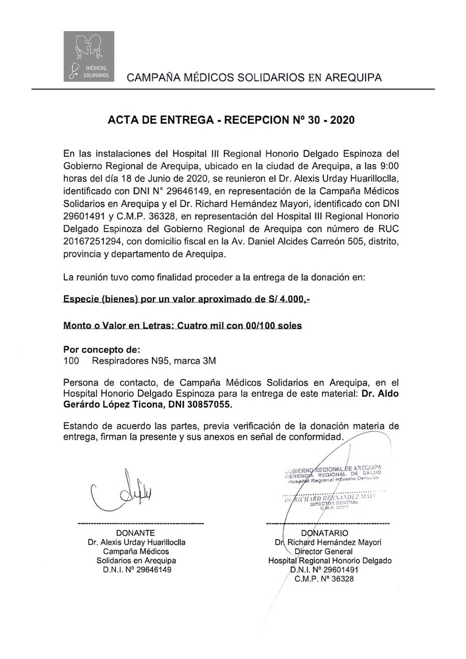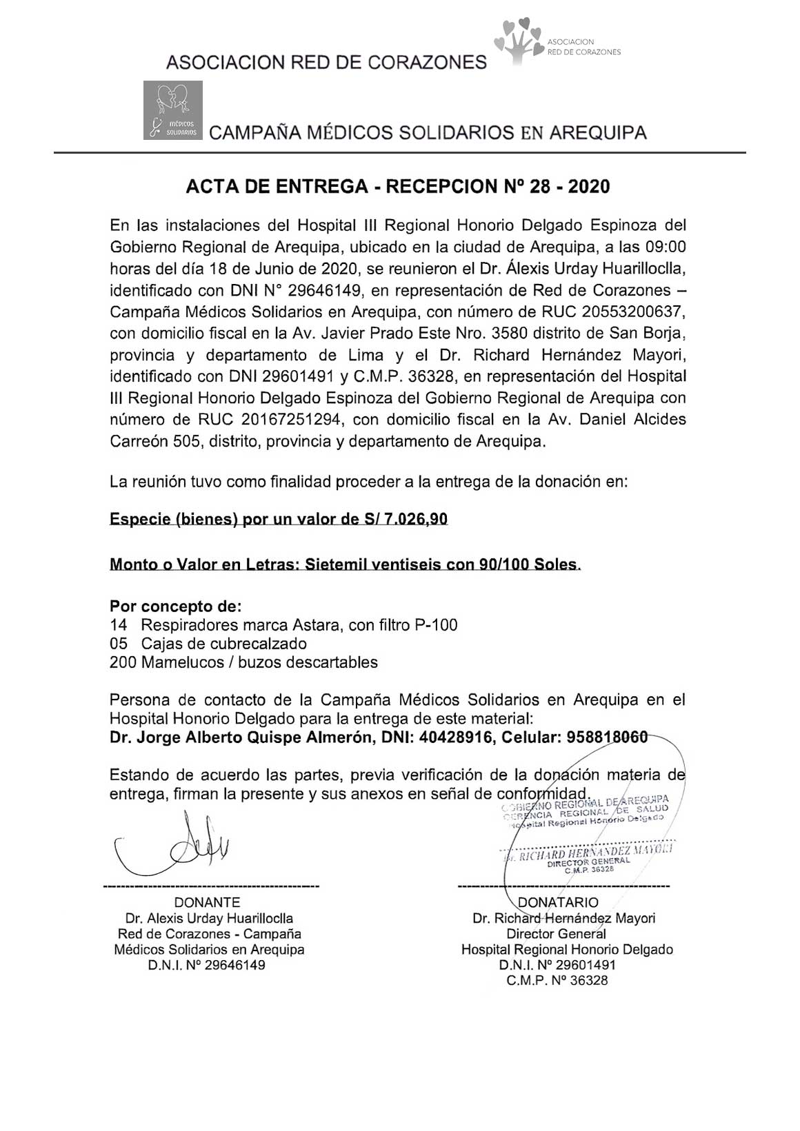 Donación al Hospital Honorio Delgado, 18 de Junio de 2020
