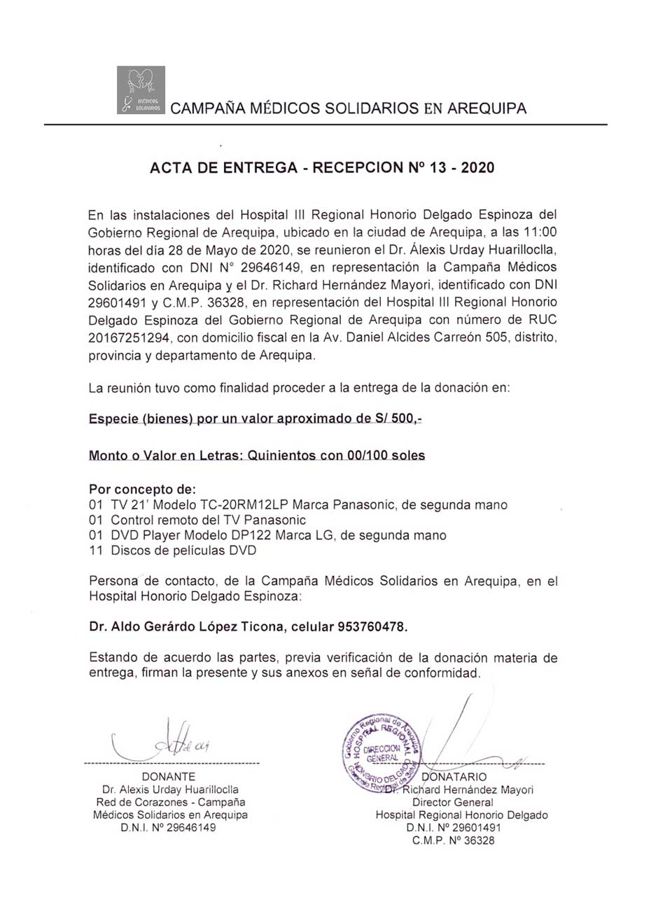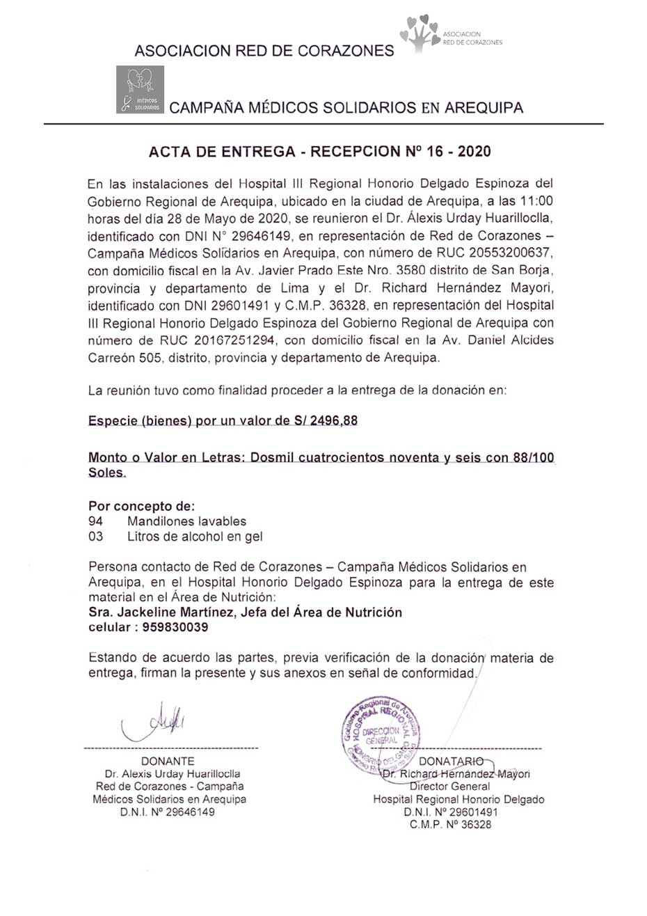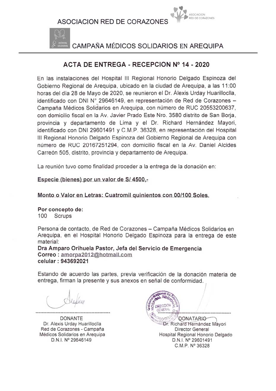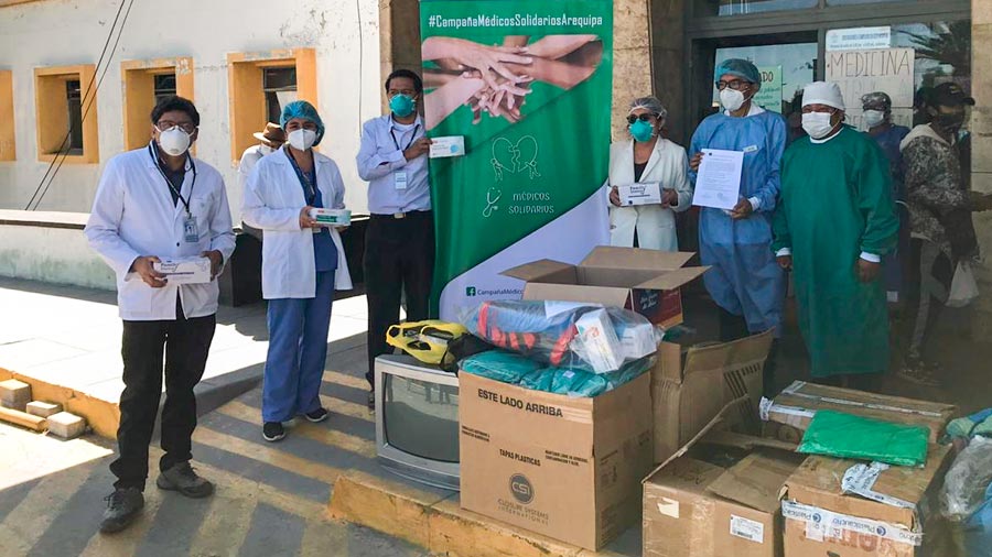 La Red de Corazones y la Campaña Médicos Solidarios en Arequipa entregan una donación al Hospital Regional Honorio Delgado.