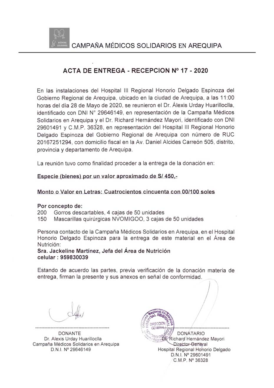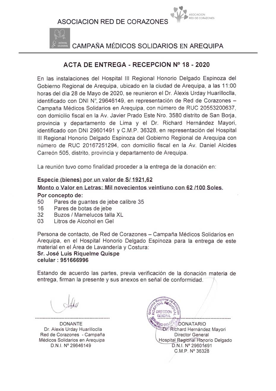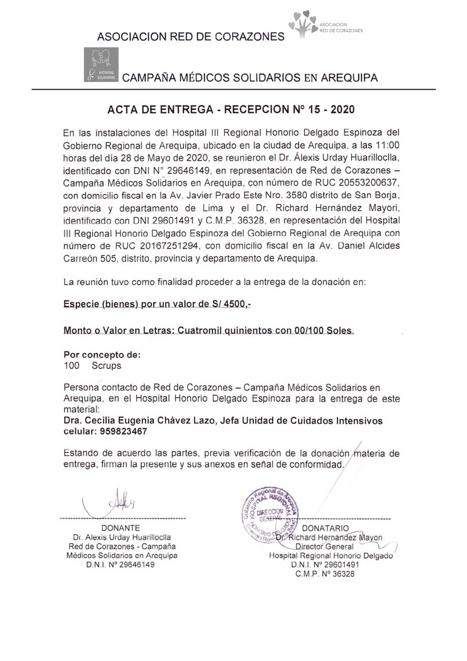 La Red de Corazones y la Campaña Médicos Solidarios en Arequipa entregan una donación al Hospital Regional Honorio Delgado.
