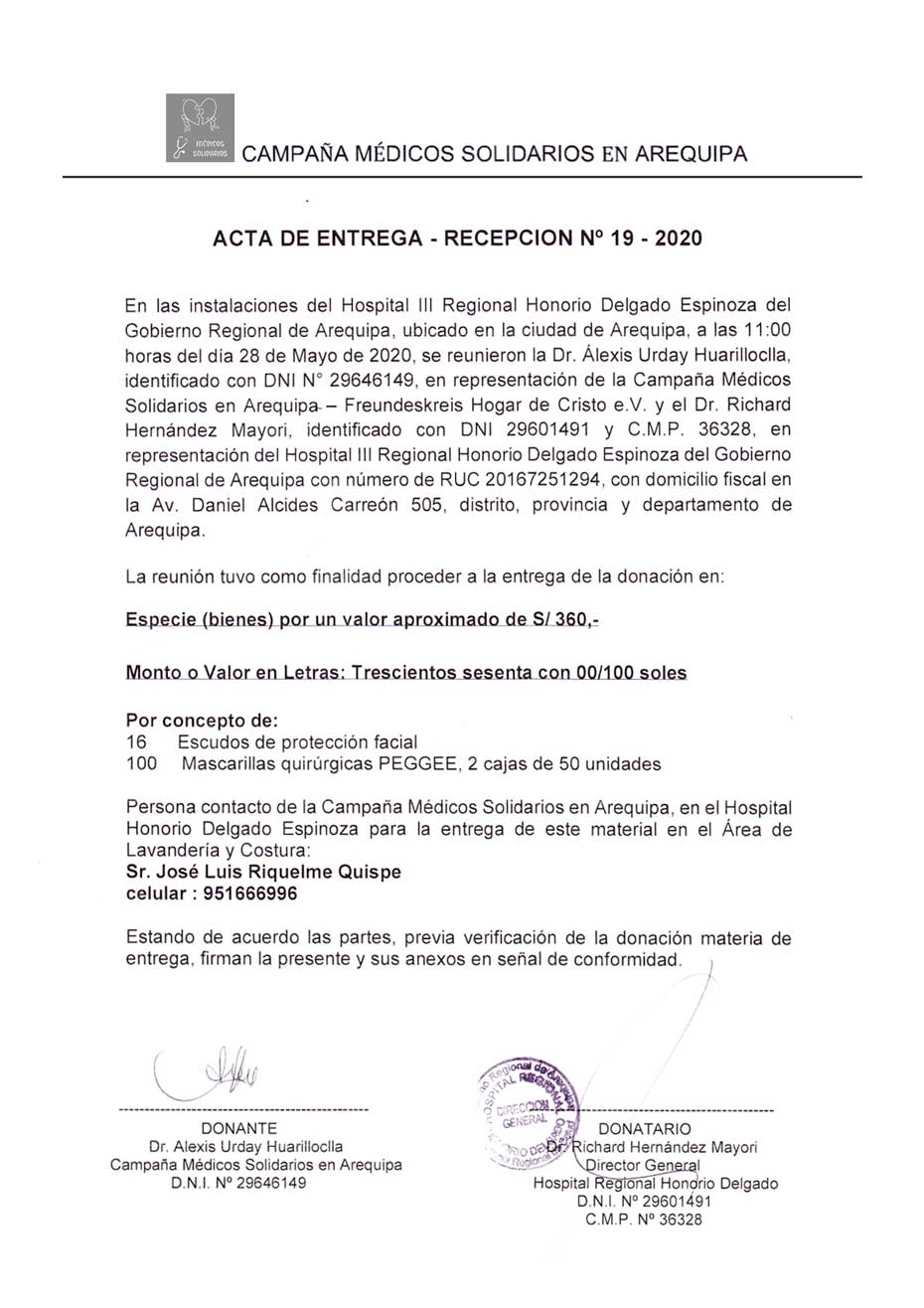 Donación al Hospital Honorio Delgado, 28 de Mayo de 2020