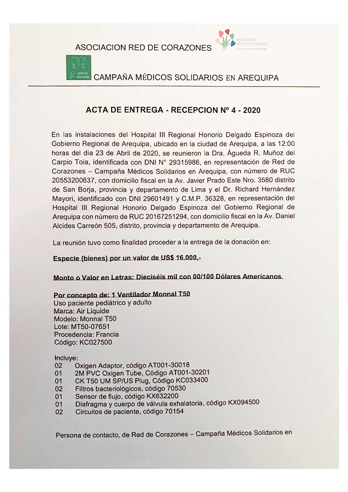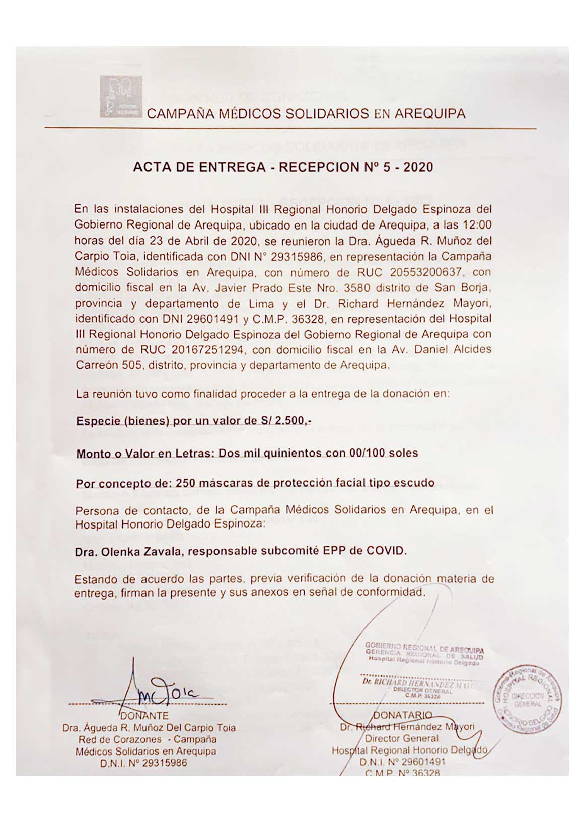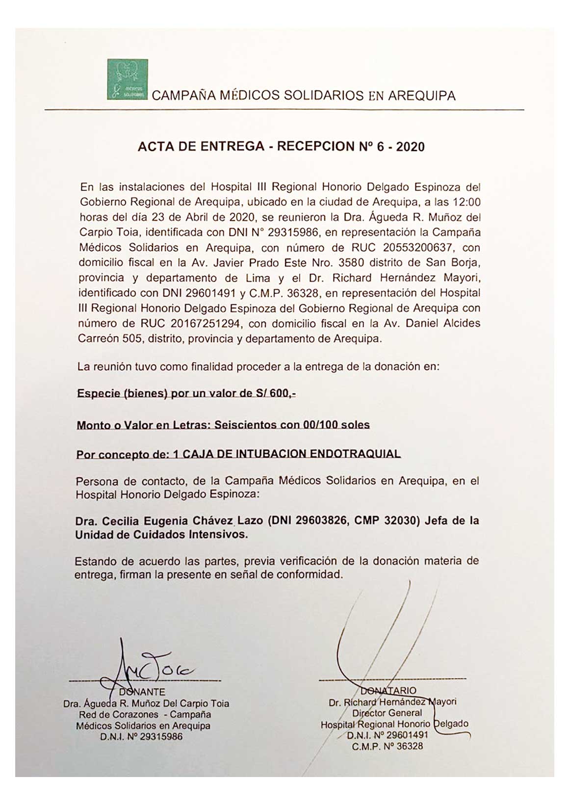 Donación al Hospital Honorio Delgado, 23 de Abril de 2020