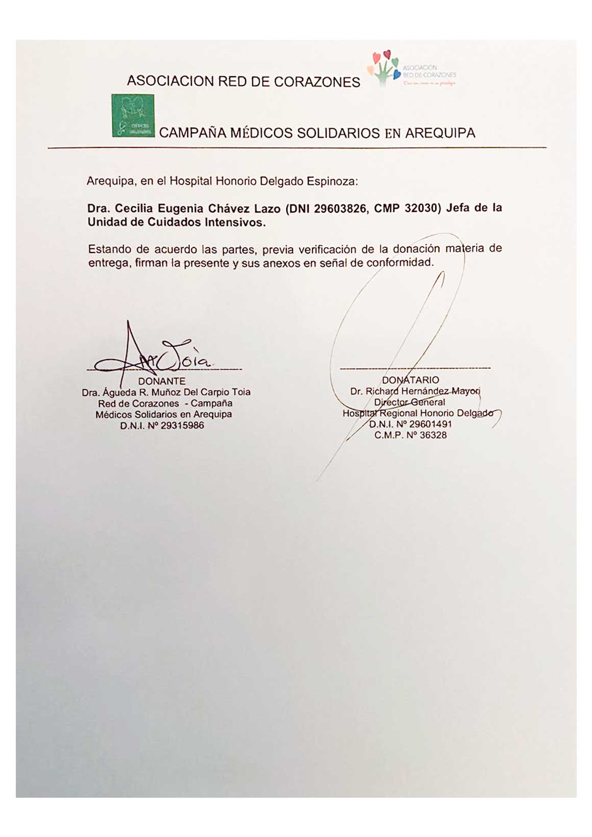 La Red de Corazones y la Campaña Médicos Solidarios en Arequipa entregan donaciones al Hospital Honorio Delgado.